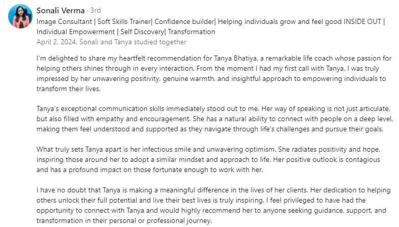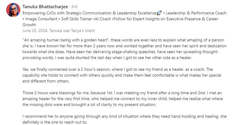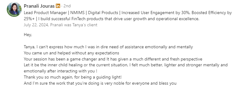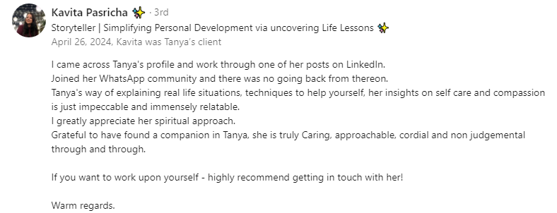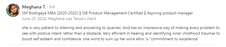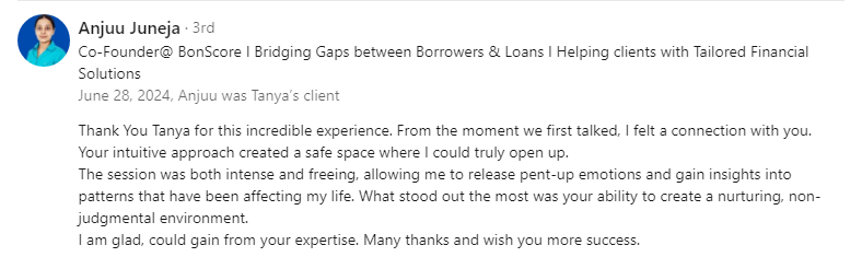 Kavita found Tanya's life and confidence coaching program transformative, helping her overcome emotional barriers and become a more fulfilled version of herself. Tanya’s compassionate and adaptive approach made her feel supported throughout the process. The inner child healing sessions were especially impactful, allowing Kavita to address past traumas and grow personally. She highly recommends investing in personal growth for long-term well-being.