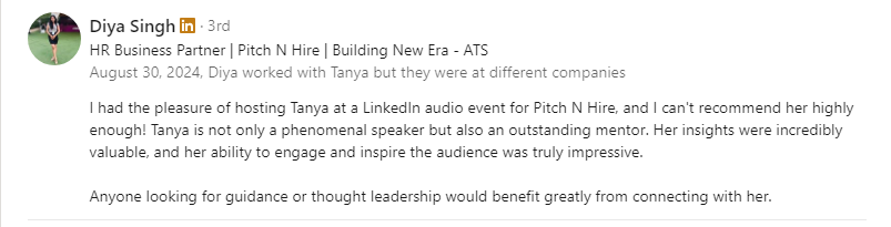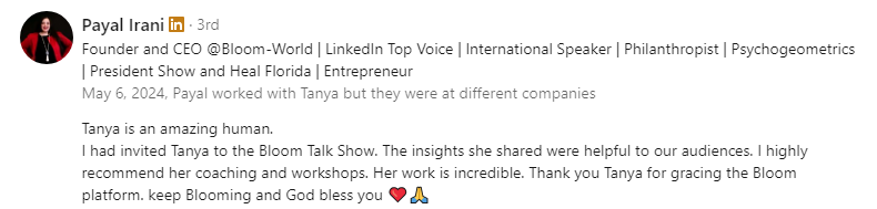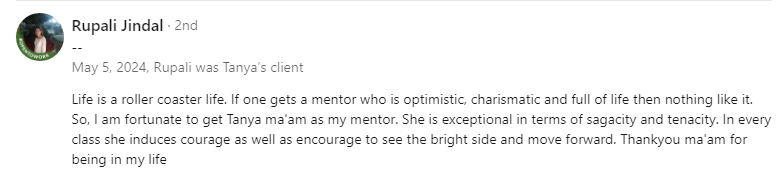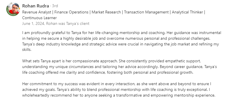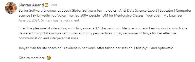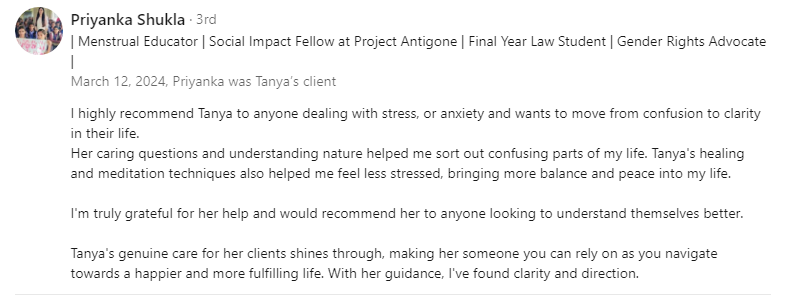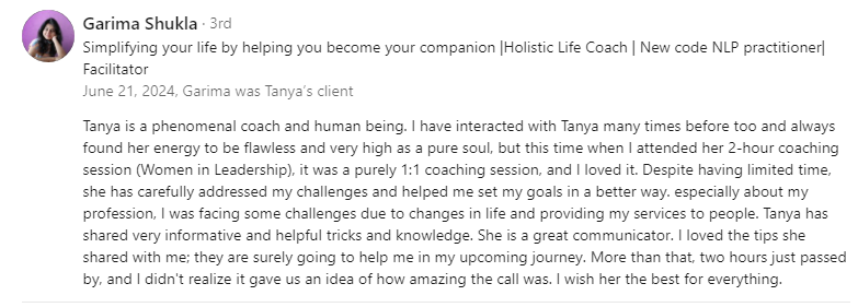 Sukriti describes Tanya as a flexible, non-judgmental coach who customizes sessions to individual needs. She appreciates Tanya’s professionalism, attention to timing, and follow-ups, as well as the practical tools she provided. Tanya’s patience and personal touch made Sukriti feel comfortable and supported throughout the coaching process.