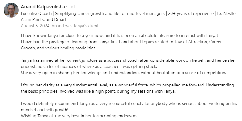 I enrolled with Tanya for a mindset program at the beginning of this year. It’s been a transformative experience for me! Tanya is very organized, passionate and professional in her approach. What I personally like about the program is she is open to begin the sessions with our requirements, come up with practical solutions, and not just go with a preset agenda. I enjoy the deep introspections she facilitates, which bring so much clarity in goals I want to achieve. The program has helped me improve my mindfulness, positive self-talk, to overcome my limiting beliefs and courage to speak up. I am amazed at the progress made on the goals I had set for the year. I would like to thank Tanya and recommend her as a mentor/coach to all who want to work on their personal growth.